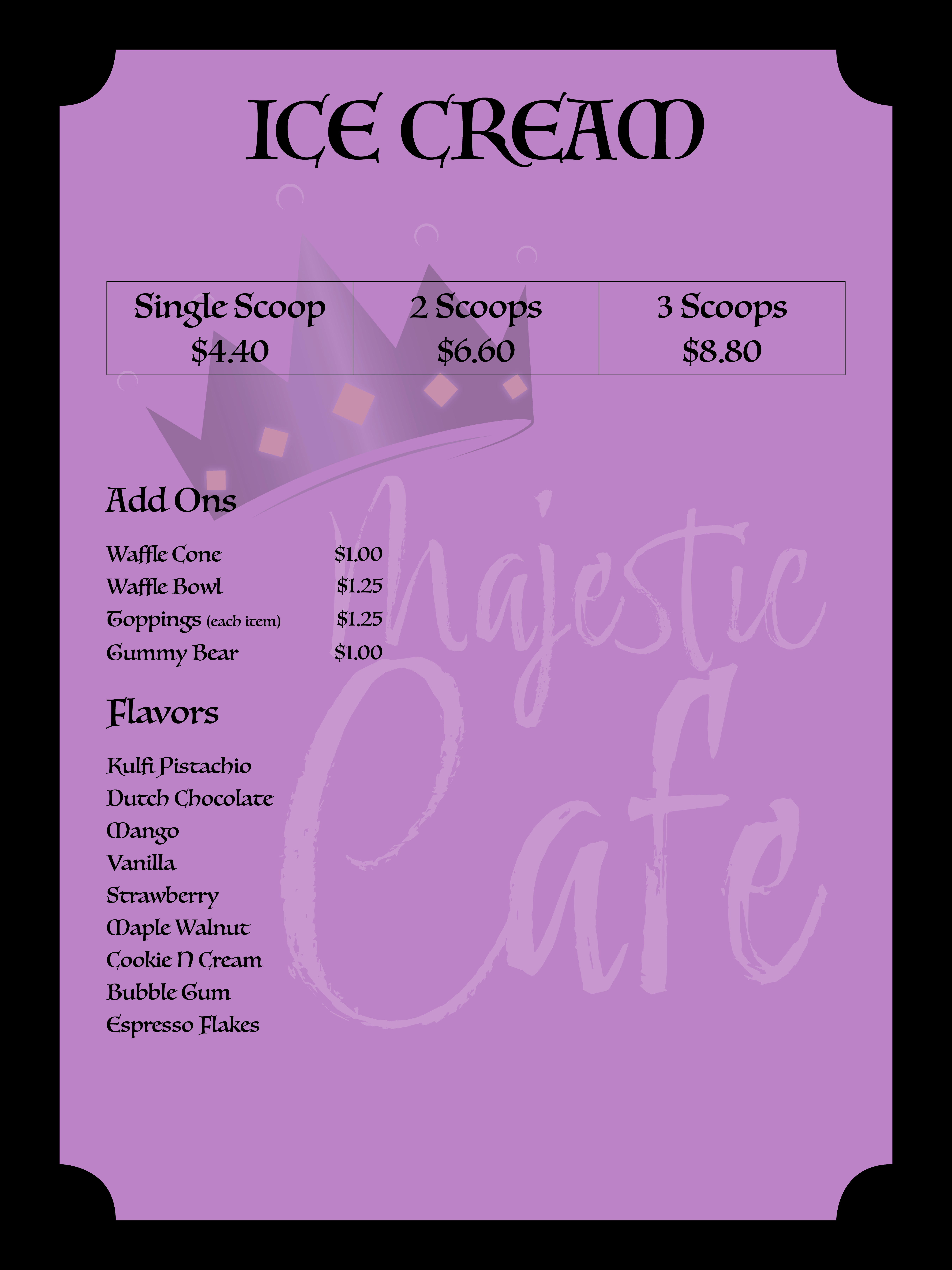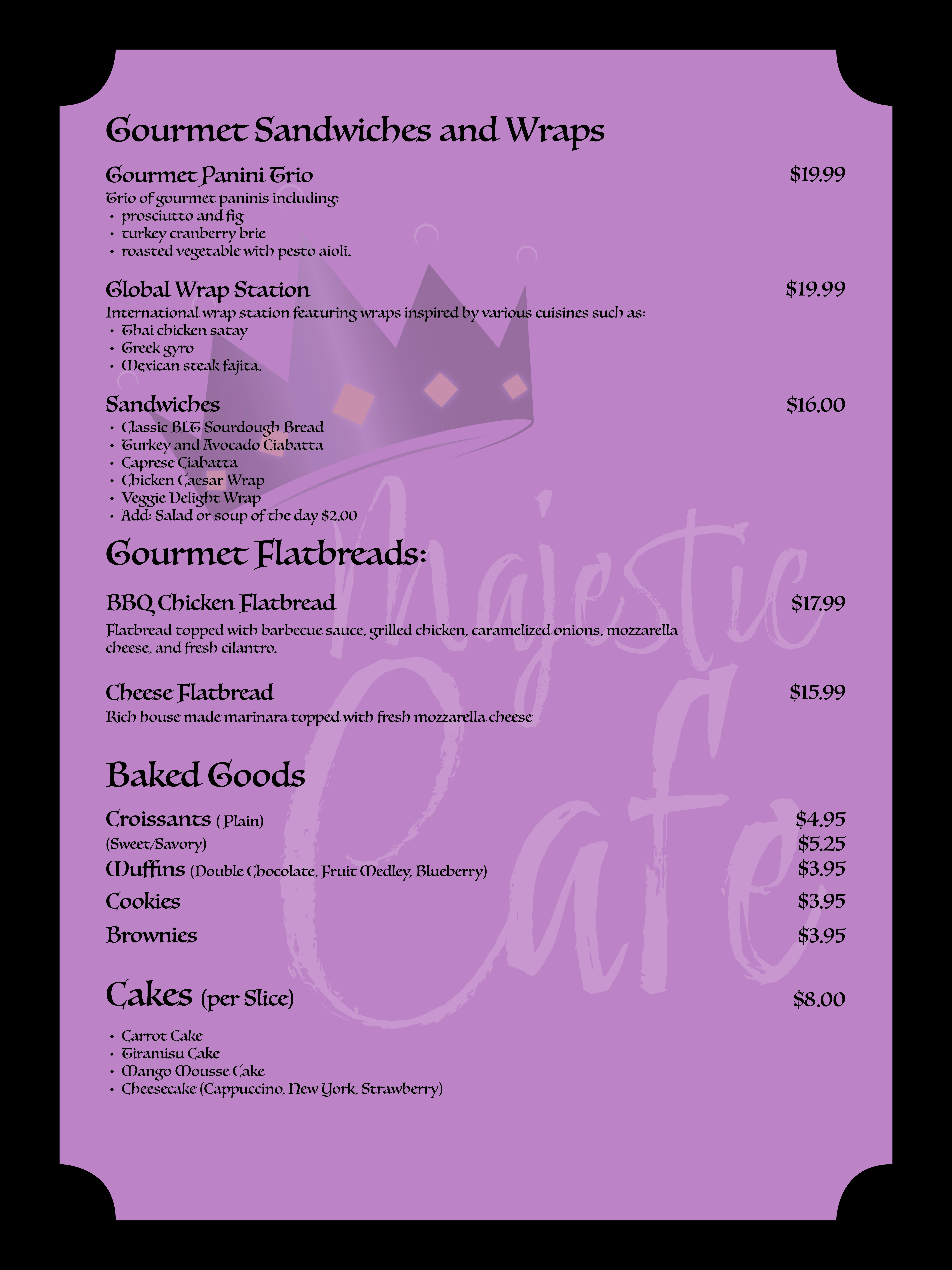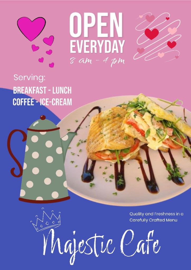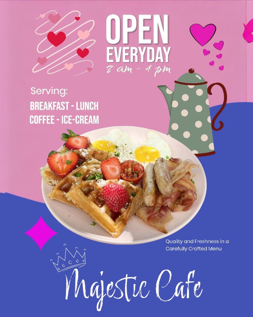 Welcome to Majestic Cafe! Treat yourself to an elegant experience with our finest selection of coffee or tea, complemented by our all-day breakfast menu and delicious bakery items. Join us for a truly delightful dining experience.