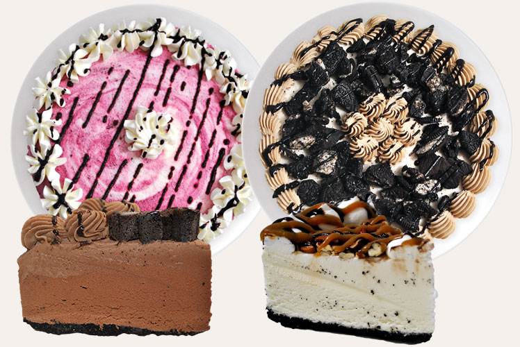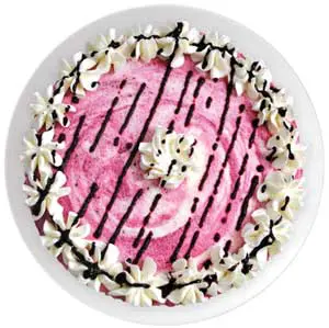 Authentic cheesecake based ice cream with a thick marbled raspberry swirl, topped with buttercream icing, on a chocolate cookie crumble crust.