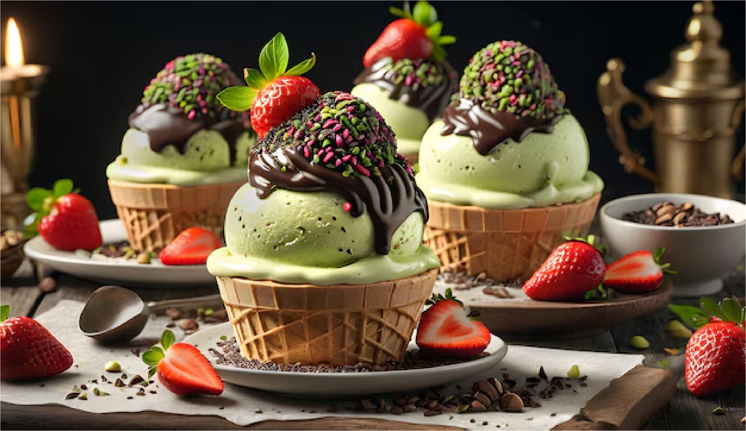 Our selection of ice cream is sure to bring a smile to your face. Indulge in a variety of flavors, including Dutch Chocolate Cake, Vanilla, Mango, Strawberry, Bubble Gum, Kulfi Pistachio, Maple Walnut, Cookies and Cream, and Black Cherry.