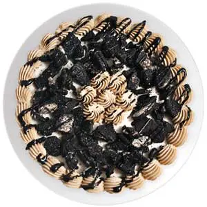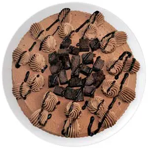 Heavenly chocolate ice cream topped with moist brownie chunks and chocolate buttercream icing, on a chocolate cookie crumble crust.