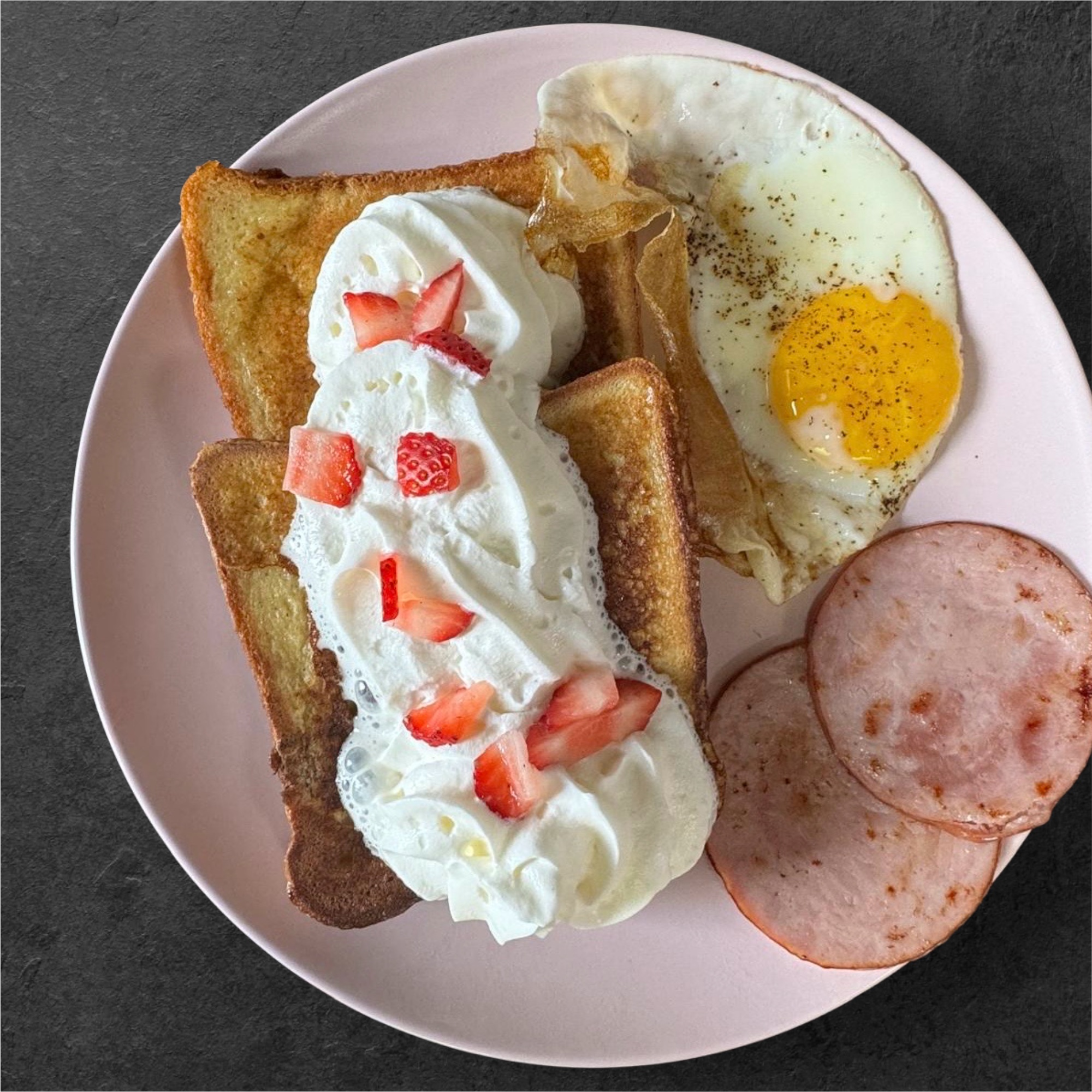 Served with bacon/ham /slices of thick & fluffy bread dipped & griddled in our new vanilla, cinnamon French toast batter